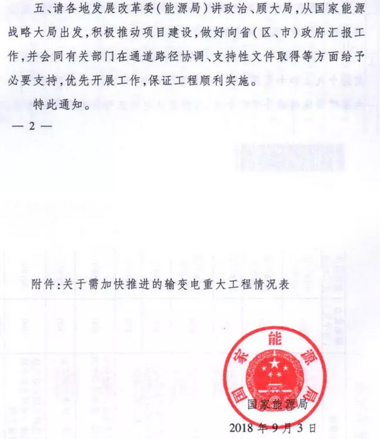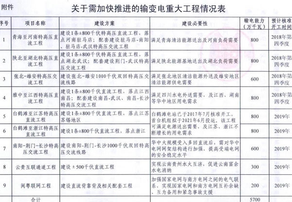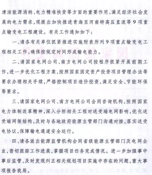 9月7日獲悉,國家能源局印發(fā)《關于加快推進一批輸變電重點工程規(guī)劃建設工作的通知》國能發(fā)電力〔2018〕70號,《通知》指出,為加大基礎設施領域補短板力度,發(fā)揮重點電網(wǎng)工程在優(yōu)化投資結構、清潔能源消納、電力精準扶貧等方面的重要作用,加快推進青海至河南特高壓直流、白鶴灘至江蘇、白鶴灘至浙江特高壓直流等9項重點輸變電工程建設,合計輸電能力5700萬千瓦(工程見附件)。