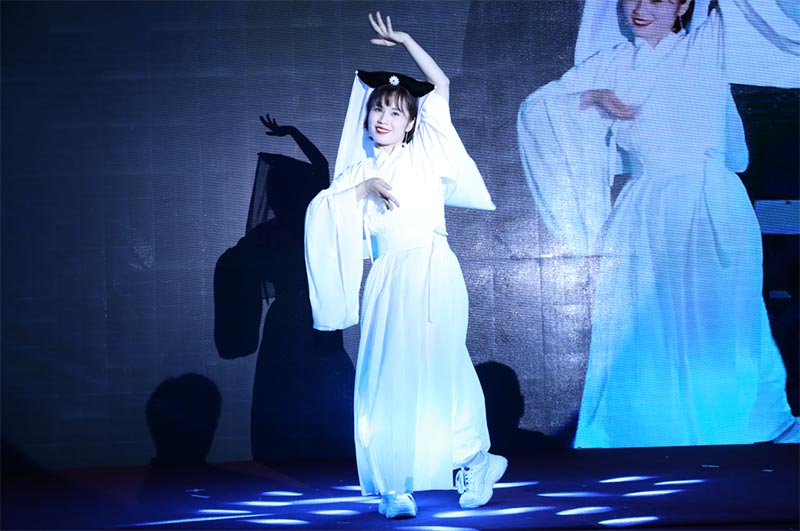 第九個(gè)節(jié)目是公司店慶舞蹈總指揮帶來(lái)的獨(dú)舞《白蛇傳說(shuō)》,優(yōu)柔舞姿,翩翩入戲